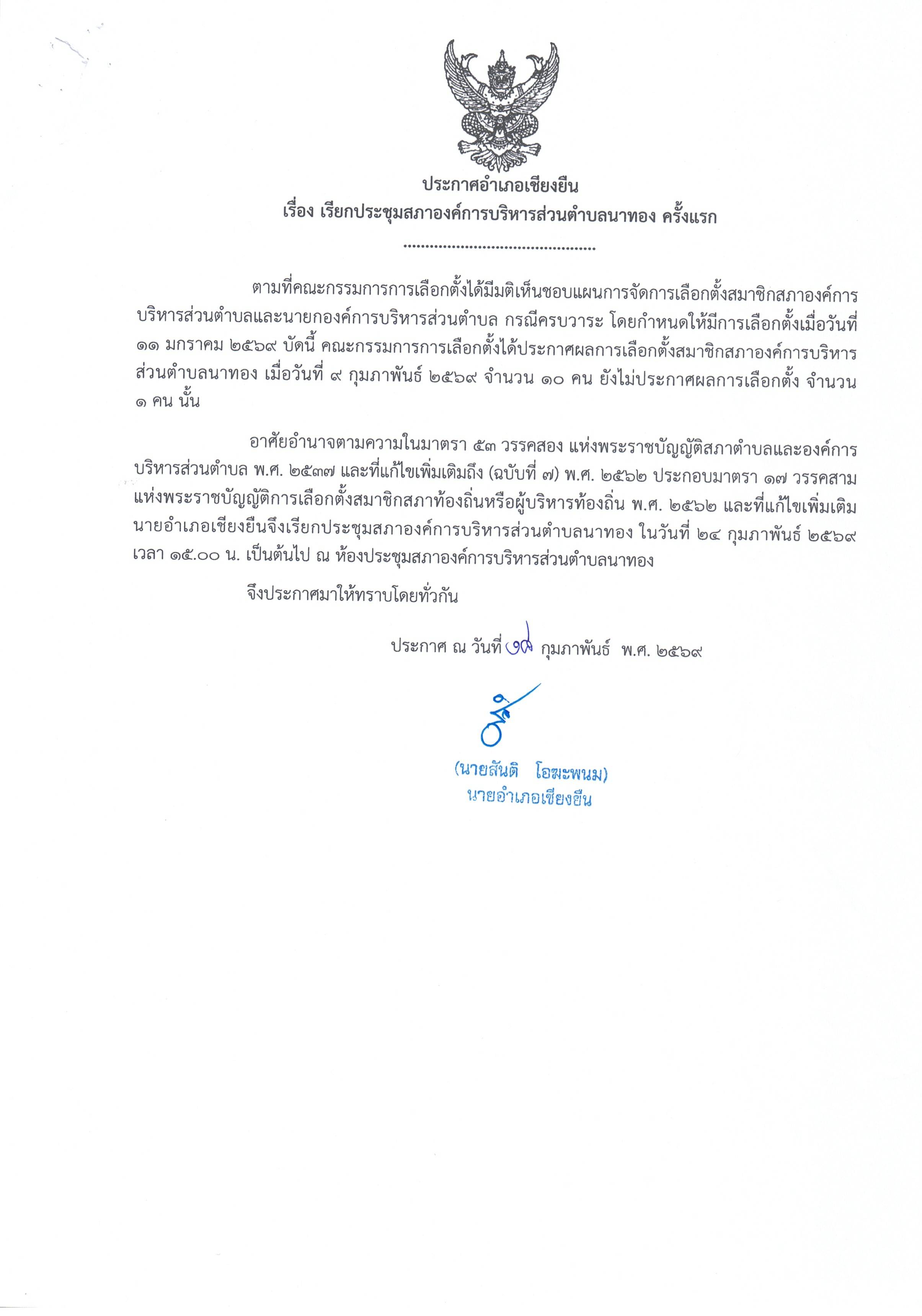 ประกาศอำเภอเชียงยืน เรื่อง เรียกประชุมสภาองค์การบริหารส่วนตำบลนาทอง ครั้งแรก